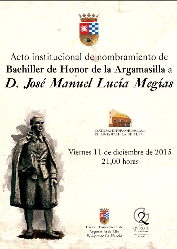 Este viernes 11 de diciembre (21 h., Teatro-Auditorio), José Manuel Lucía Megías va a ser nombrado bachiller de honor de Argamasilla de Alba, la máxima distinción que otorga esta institución, en reconocimiento por su trayectoria académica como cervantista. Entre otros muchos logros, hay que destacar que Lucía Megías ha sido presidente de la Asociación de Cervantistas (2012-2015) y uno de los cervantistas más dinámicos del panorama hispánico.